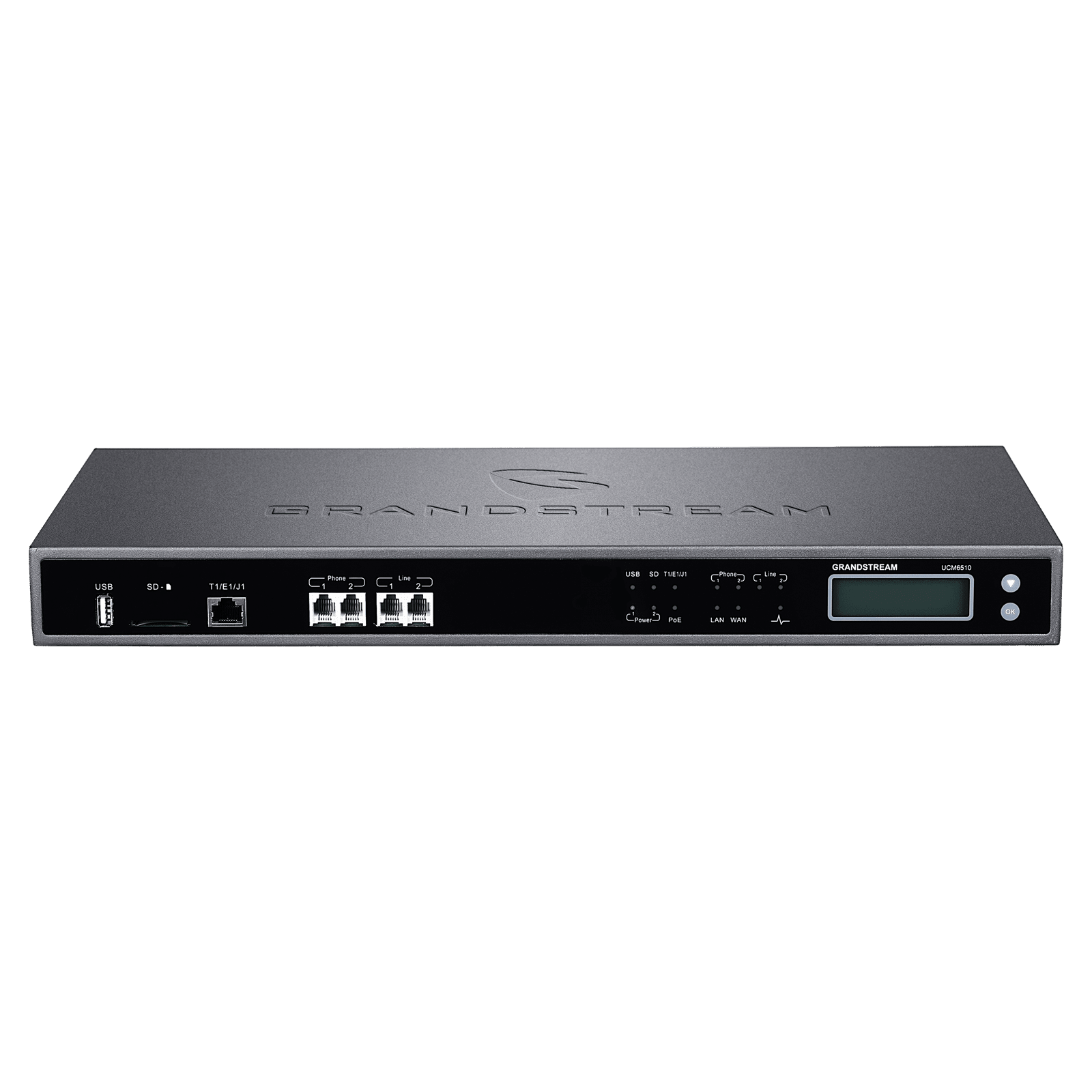 UCM6510 VoIP SIP PBX, 1 x T1 / E1, 2 x FXS, 2 x FXO, 1 x Gigabit Ethernet (switched or routed), USB, SD, AC + PoE+, 128×32 dot matrix LCD.